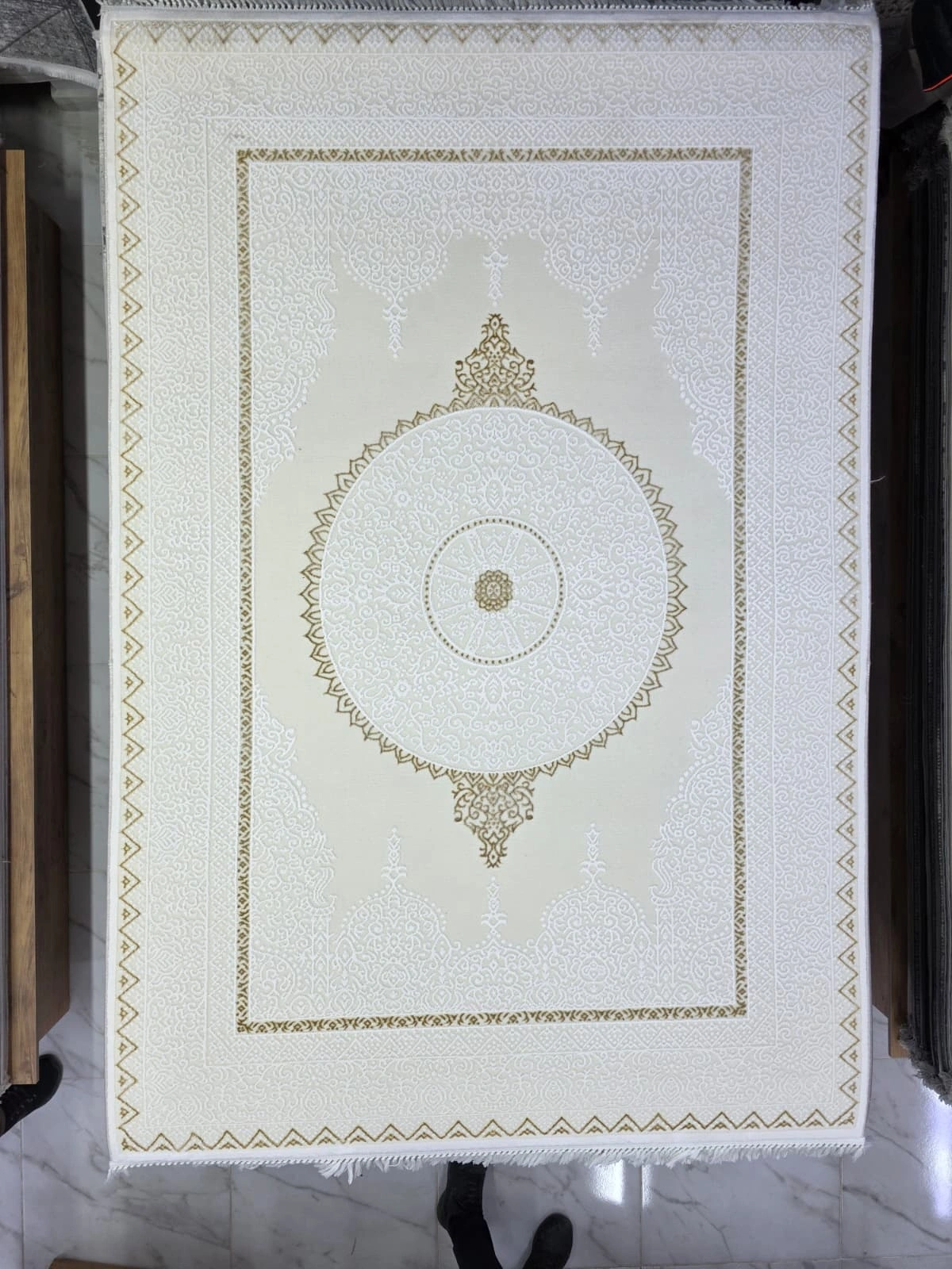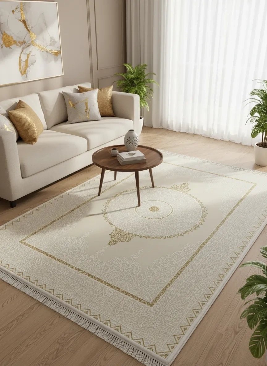 Sevimli Avanos AK171 Beyaz Gold Flosh Rozet Madalyonlu Halı, parlak beyaz kadifemsi flosh yüzeyi üzerinde altın sarısı ince bordür çerçevesi ve tam merkeze yerleştirilmiş devasa dairesel güneş-rozet madalyonuyla Osmanlı ve İslam sanatının kubbe ve rozet geleneğini zemine yansıtan görkemli bir tasarım. Madalyonun iç içe geçen geometrik halkalar ve arabesk detaylarıyla oluşturduğu sonsuzluk hissi, flosh yüzeyin kadifemsi ışıltısıyla birleşince mekânınıza Selimiye Camii kubbesi zarafetini andıran bir atmosfer kazandırıyor. Beyaz gold halı ve rozet madalyonlu halı arayanlar için Türkiye'nin en etkileyici seçeneklerinden biri olan bu model, düğün salonları, lüks konutlar, premium otel projeleri ve prestijli kurumsal mekânlar için biçilmiş kaftan. Mandala ve rozet tasarımlı halı arayan yeni nesil dekorasyon tutkunlarının da ilgisini çeken bu eşsiz model, hereke halı estetiğini uygun fiyatla sunarken ipek görünümlü flosh yüzeyiyle görsel lüksü zirveye taşıyor. Gümüşsuyu halı, atlas halı ve royal halı arayanların gold-lüks arayışına birebir yanıt veren bu halı, en iyi halı markaları seviyesinde kaliteyle 160x230 cm boyutunda Türkiye genelinde uygun halı fiyatıyla kapıya teslim edilmektedir.