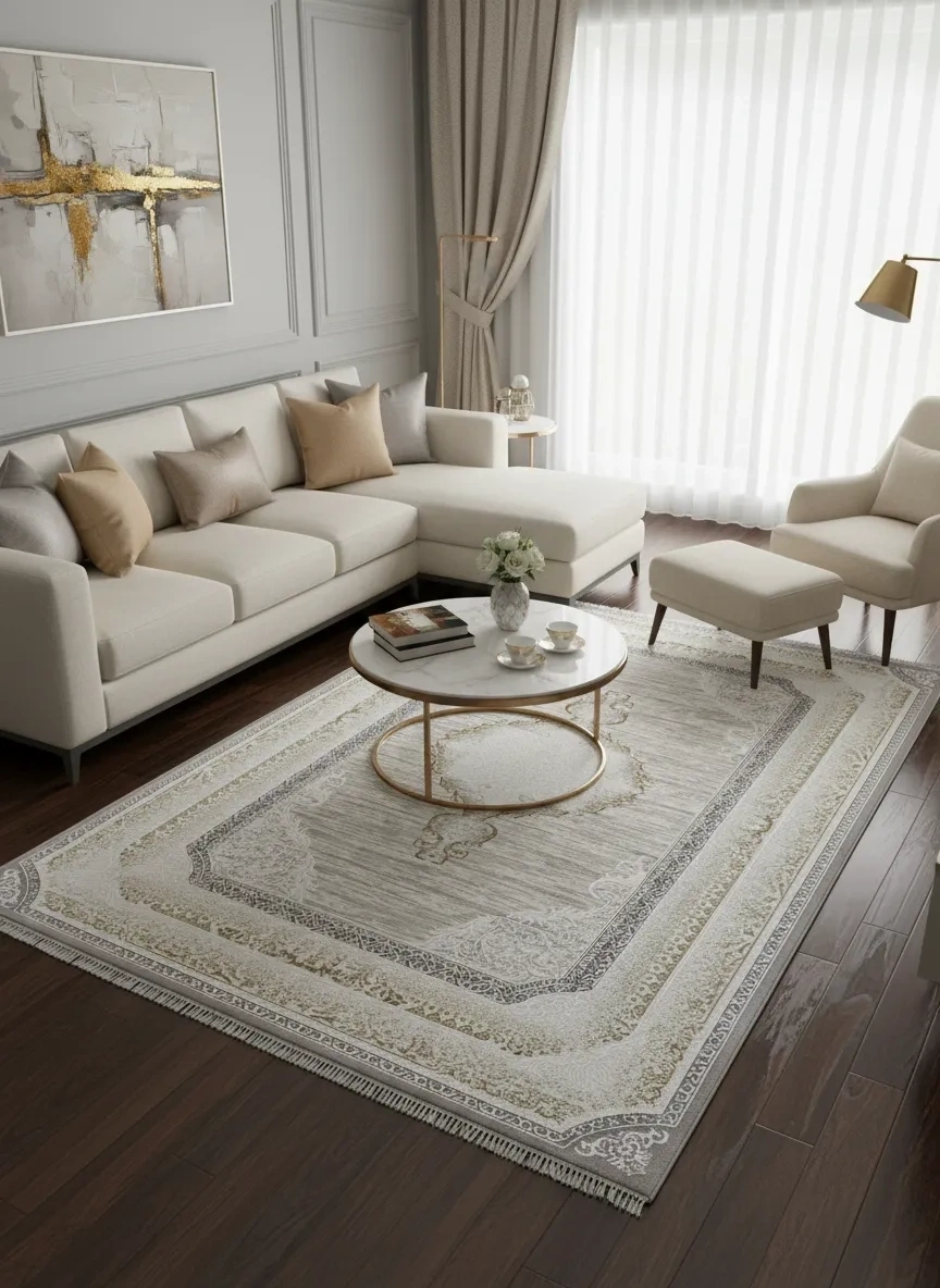 • Sevimli Avanos AK187 Beyaz-Gold modeli, beyaz floş zemin üzerinde altın-gold tonlarında işlenmiş zarif madalyon ve köşe motiflerinin kontrast güzelliğiyle lüks bir görünüm sunar. Bu halı, beyaz ve altın tonlarında halı arayanlar, modern-lüks dekorasyon yapanlar ve floş halı kalitesini arayanlara birebir uygun bir üründür. Sevimli halı markasının bu modeli, 200x290 cm boyutuyla geniş salon ve oturma odaları için uygundur.