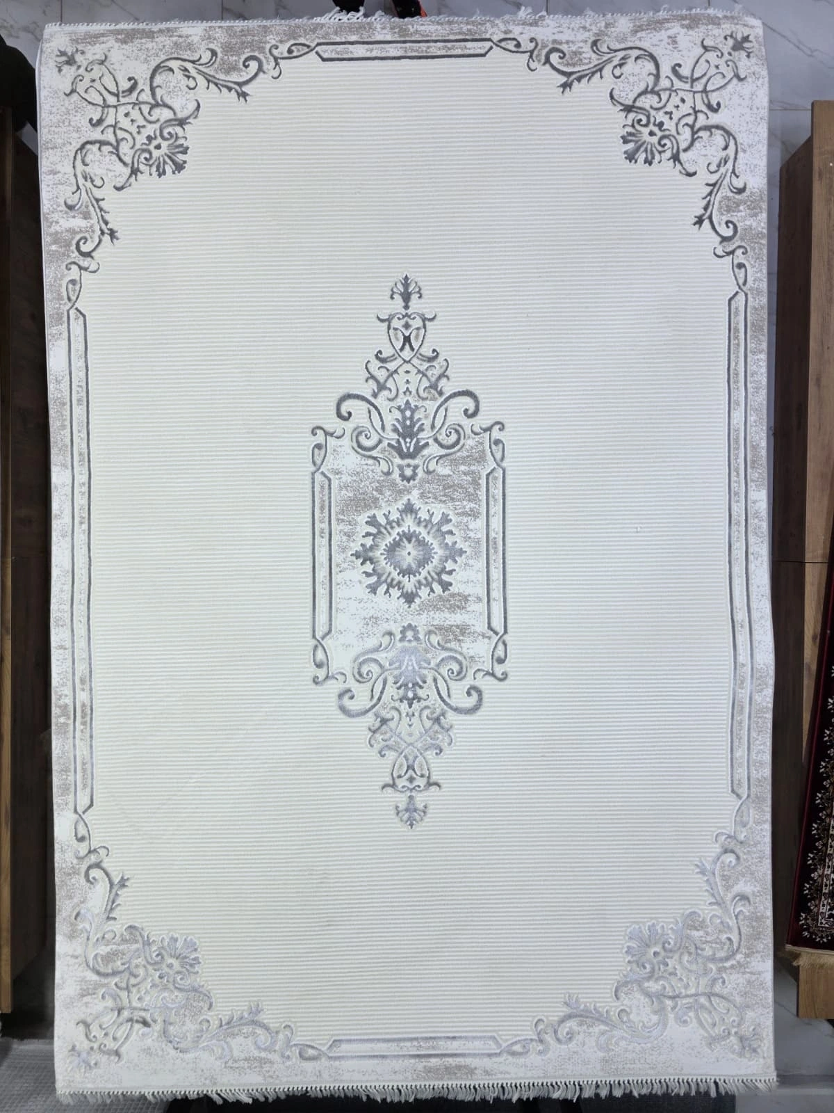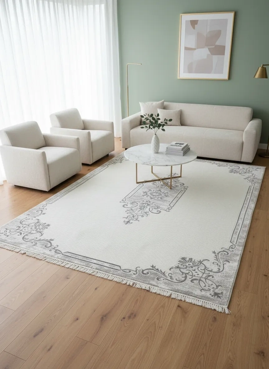 • Sevimli Soft Platinum AK085 Beyaz-Gri, beyaz zemin üzerinde gri tonlarında floş çiçek motifleri ve merkezdeki zarif madalyon tasarımıyla hem klasik hem modern dekorasyona uyum sağlar. Soft Platinum serisi, floş dokusuyla mükemmel bir yumuşaklık hissi sunarken görsel olarak da son derece şık bir görünüm sergiler. Beyaz ve gri tonlarında halı arayanlar için en iyi seçeneklerden biri olan bu ürün, 200x290 cm boyutuyla geniş salon ve oturma odaları için uygundur.