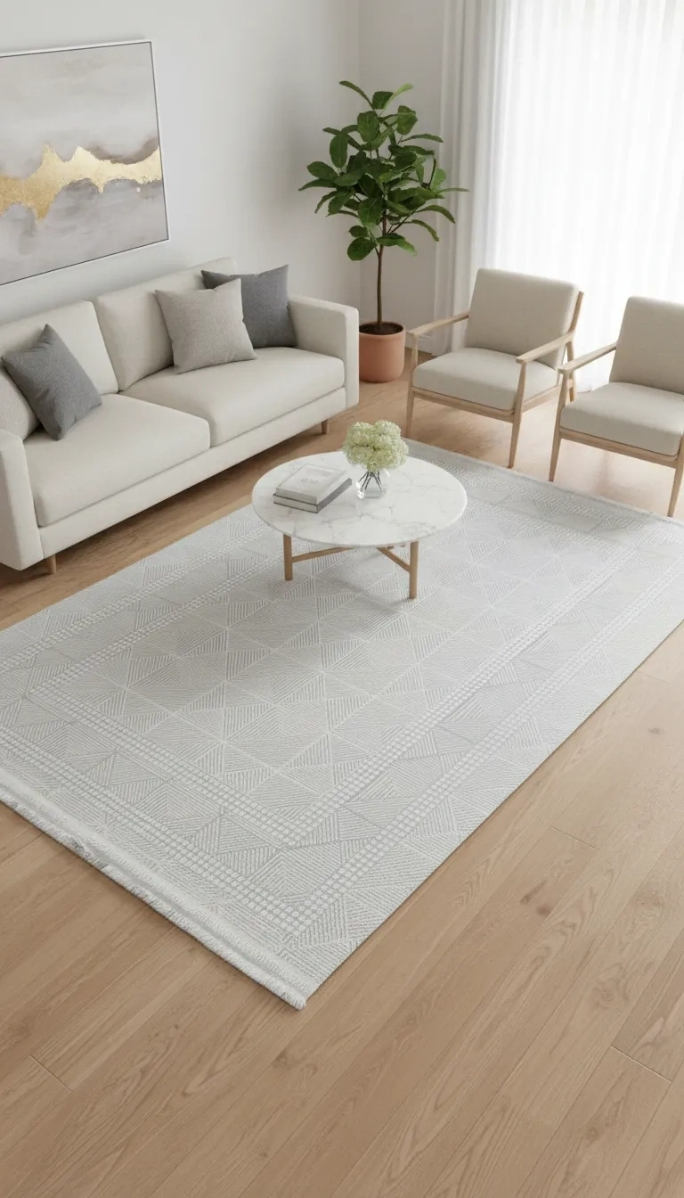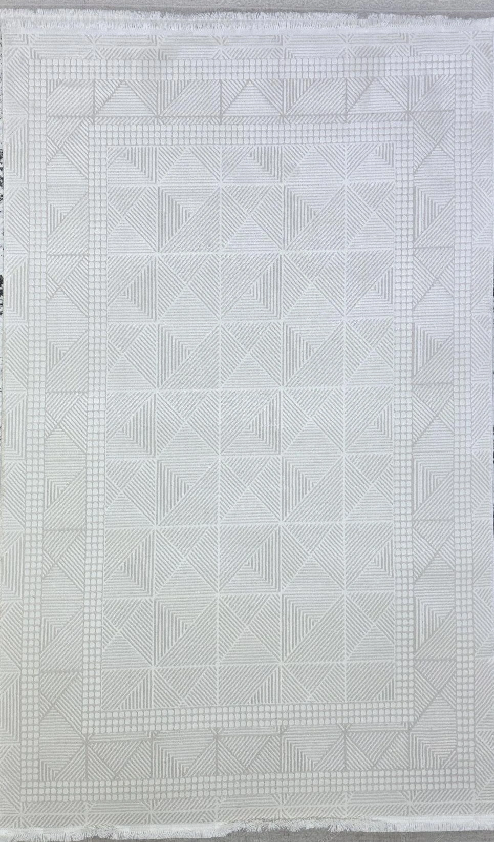Veseo Armoni 40071A Krem Halı, krem ve beyaz tonlarında birbirini kesen üçgen çizgi formlarının bordürlü simetrik bir düzende bir araya geldiği zarif ve modern bir tasarım sunar. Her üçgenin kendi içinde farklı geometrik çizgi yönelimlerini taşıması, halıya görsel hareket ve doku zenginliği kazandırır. Oturma odası, yemek odası, antre, koridor ve yatak odası gibi her alanda kullanılabilen bu halı, krem rengi ve geometrik deseniyle hem minimalist hem de modern tarzda dekore edilmiş mekânlarda uyumludur. Beyaz, bej, krem ve doğal tonlu dekorasyonlarla kusursuz uyum sağlar. Veseo Armoni serisinin kaymaz tabanlı kaliteli makine dokuması, 150x220 cm ölçüsüyle güvenli ve uzun ömürlü kullanım sunar.