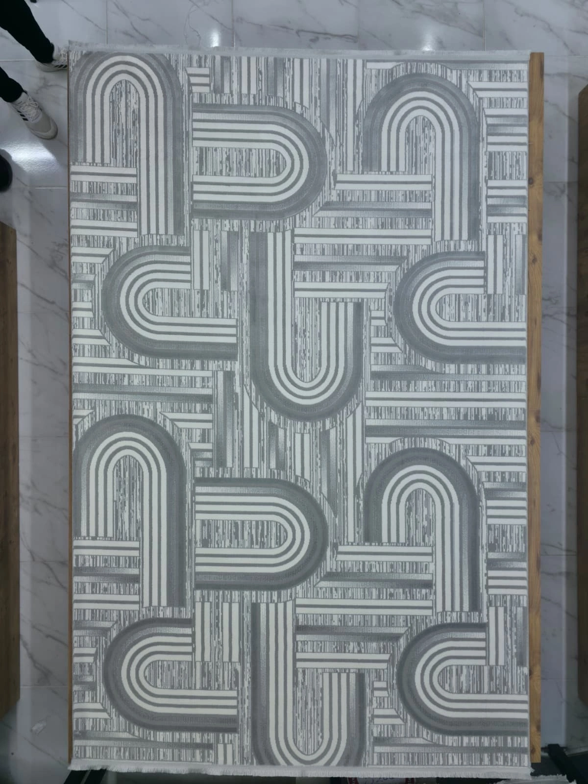 Veseo Armoni 40103A Açık Gri Halı, beyaz zemin üzerinde açık gri tonlarında büyük ölçekli birbirine kenetlenmiş labirent ve S-kıvrım desenlerinden oluşan güçlü geometrik bir tasarıma sahip. Kalın ve etkileyici motif büyüklüğü, halıya grafik sanat niteliği kazandırıyor. Modern, industrial, contemporary ve Bauhaus tarzlı mekânlarda güçlü bir dekor ifadesi sunan bu halı; beyaz, açık gri ve metalik aksesuar ile mobilyalarla harika uyum sağlar. Büyük salon ve oturma odaları için güçlü bir tercih. 200x290 cm ölçüsü ve makine dokumasının sağlam yapısıyla uzun yıllar kullanıma uygundur.