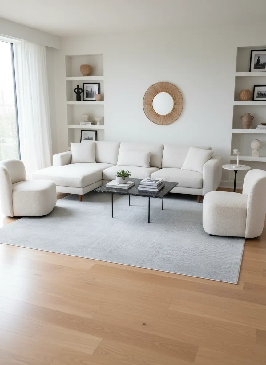 Veseo Armoni 40194B Açık Gri Halı, soft açık gri zemin üzerinde oval ve kapsül biçimli yiv deseni taşıyan şık minimalist bir tasarım. Kabartmalı oval motiflerin yarattığı doku ritmi, sade renk paletini sanatsal biçimde zenginleştiriyor. Minimalist, İskandinav, modern ve Japandi tarzlı dekorasyonlarda öne çıkan bu halı; beyaz, açık gri, antrasit ve doğal ahşap mobilyalar ile mükemmel uyum sağlar. Oturma odası, salon, yatak odası ve çalışma odaları için uygun çok yönlü bir zemin kaplama. 200x290 cm ölçüsü ve makine dokumasının güçlü yapısıyla uzun yıllar kullanıma uygundur.
