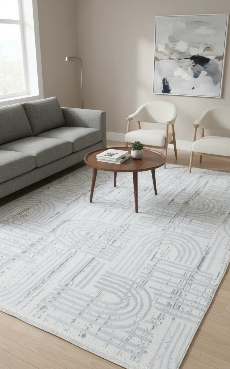 Veseo Asil NU1332 Krem-Beyaz Halı, aynı modelin gri versiyonundan farklı olarak ferah krem zemin üzerinde beyaz tonlarda soyut çizgi ve labirent formlarının özgür bir kompozisyon oluşturduğu sıcak ve enerjik bir tasarım sunar. Krem zeminin sıcaklığı ile beyaz çizgilerin dinamizmi birleşerek mekânlara hem canlı hem de konforlu bir zemin atmosferi katar. Oturma odası, yemek odası, antre, koridor ve yatak odası gibi evin her alanında kullanılabilen bu halı, özellikle beyaz dominant mekânlarda sıcaklık katmak için mükemmel bir zemin tercihi sunar. Bej, krem, beyaz ve doğal tonlu dekorasyonlarla uyumludur. Veseo Asil serisinin kaymaz tabanlı kaliteli makine dokuması, 150x220 cm ölçüsüyle güvenli ve uzun ömürlü kullanım sunar.